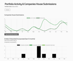 Does Kudocs provide an audit log of Companies House filings within a particular portfolio? Yes. The Portfolio Activity & CH Submissions page (for portfolio customers only) shows a summary of all Companies House filings for all entities in the portfolio (as well as being able track filing history within the activity timeline of a particular entity). You can see a summary of filings as a graph, and then a more detailed list of filings over time.