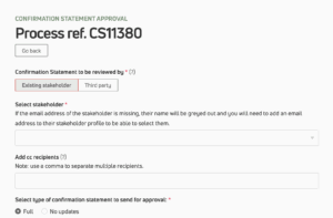 You can either file the confirmation statement immediately or send it out for third party approval. This allows you to circulate a draft confirmation statement with colleagues, client contacts or external advisors etc. to check that the statement details are correct before filing.