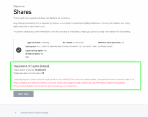 When I get to the shareholder section of onboarding, there are no shares showing for the shareholders and an error message about share class names. What is happening? Don’t worry – this is usually because of an issue with the share class names provided by Companies House – usually the share class name is different in (i) the most recent statement of capital filing and (ii) the shareholding data (from the last confirmation statement or incorporation if no confirmation statement has been filed). For more information read the FAQs below.