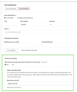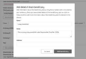 - to the legal shareholder later, by opening their stakeholder record page, scrolling down to the “Shareholding info” section and clicking on the {Add beneficiary} button. Note this is different to adding details of joint shareholders (see here for information about how to do that).
