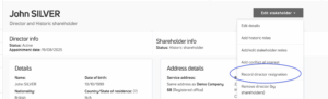 Director is removed from current director register, added to historic, Companies House updated (if selected) and information stored in Kudocs for future reference.