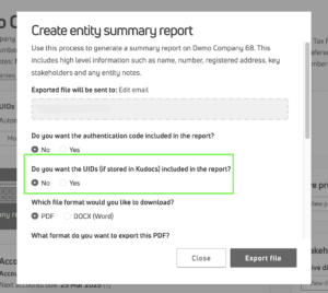 Include UID in entity summary report – you can now select to include UIDs (personal codes) in entity summary reports generated by Kudocs. The codes will show against the relevant roles for each individual.